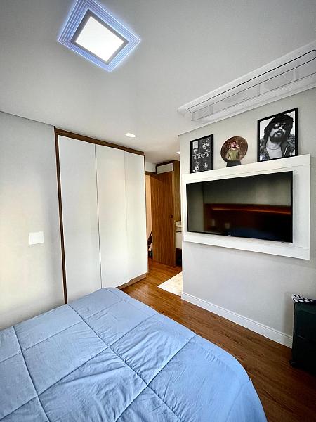 • Suíte ampla com armários planejados e banheiro moderno e bem equipado.