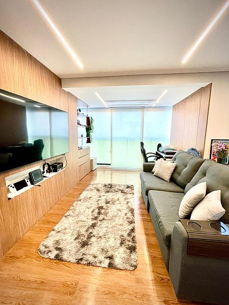 • Varanda integrada à sala, proporcionando amplitude, iluminação natural e valorizando a vista.